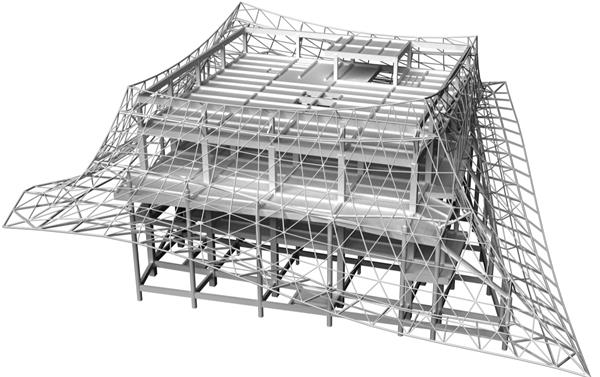 该工程表皮结构采用圆钢管相贯焊接的单层钢网格结构,局部采用平面钢桁架,表皮铝板采用白色穿孔铝板,双曲穿孔铝板外圈穿孔位置距边线20mm,其余穿孔位置为不规则孔。面对外装饰层钢结构造型复杂、精度要求高等挑战,项目部依托BIM技术构建数字化解决方案,通过Tekla软件精确计算杆件内力和优化拼装单元,将传统的二维图纸转化为三维可视化模型,便于更直观地理解复杂节点和施工流程。利用Navisworks和BIMFILM软件进行施工动画模拟,通过三维可视化模型编排制作吊装顺序,形成吊装三维演示动画,优化施工顺序和工序衔接,确保施工安全、质量,有效提高施工效率。引入智能测量技术,以全站仪、电子水准仪等设备实时监控安装精度,形成“模拟预判+动态纠偏”的质量保障体系。在钢网架安装前,将全站仪、电子水准仪、GPS定位系统采集的数据进行综合对比分析,提高测量放线精度,通过实时数据监控及时调整施工过程中的误差,实现动态纠偏。钢网架拼装单元安装完成后,通过实际测量采集数据与模型进行对比,修正调整施工误差。此外,项目部通过无人机扫描技术对安装后的钢结构骨架成品空间坐标进行验收,为后续铝板表皮安装提供精准数据,确保建筑外观效果与设计一致。
